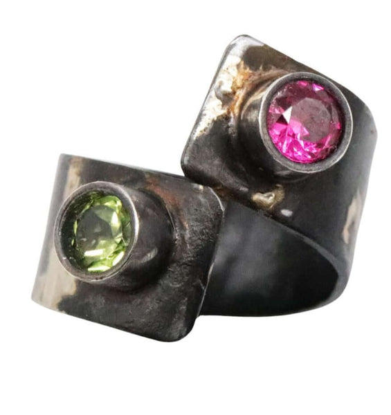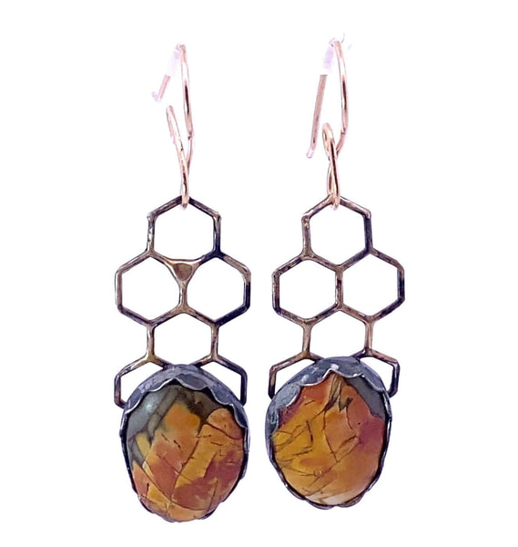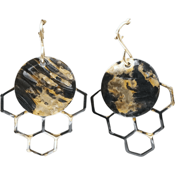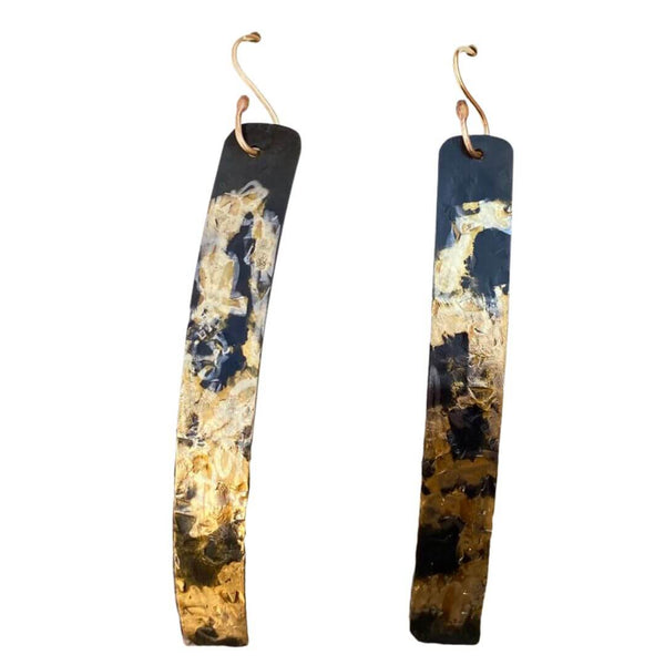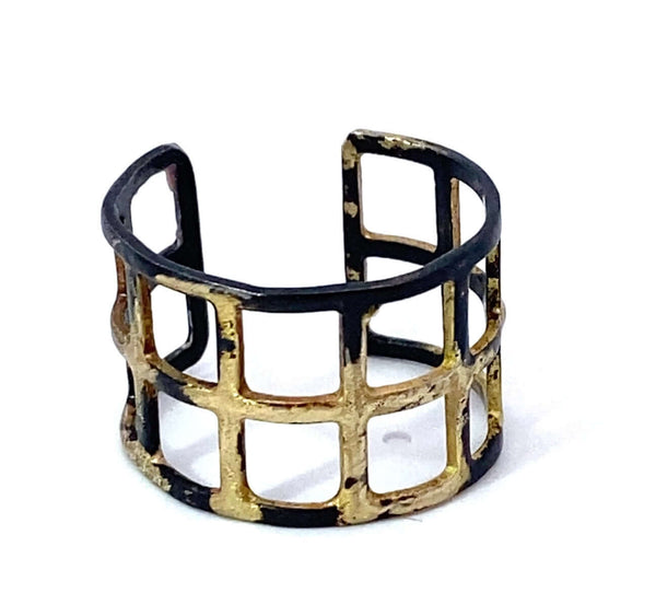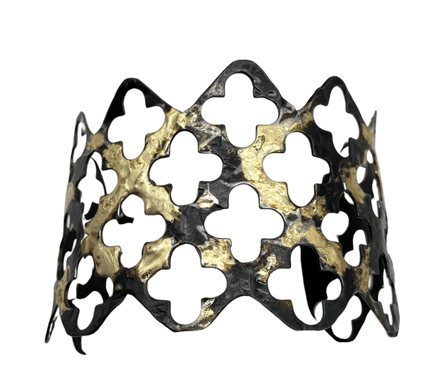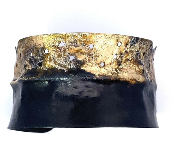 Perforated steel is smothered pure copper. The black patina creates a gorgeous backdrop for the copper. Plus this open design is more flexible and will fit most wrists easily. Stunning!