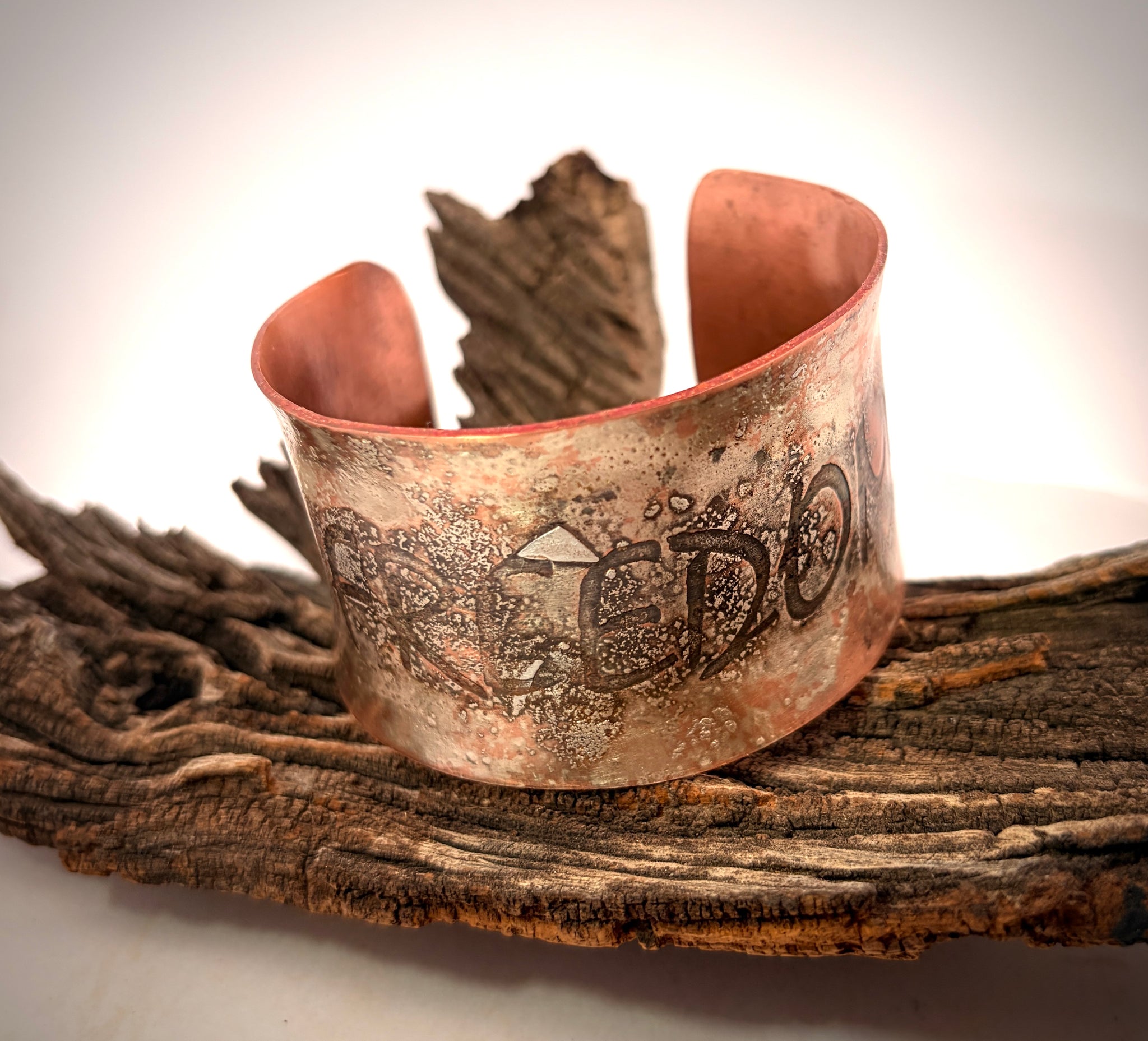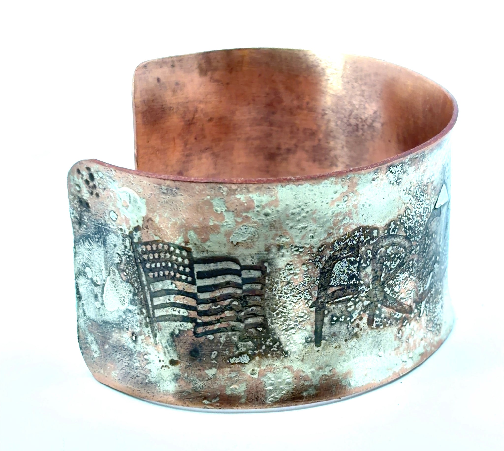 This cuff is created in pure copper with fine silver fused throughout "FREEDOM' and the American flag are etched into the copper.