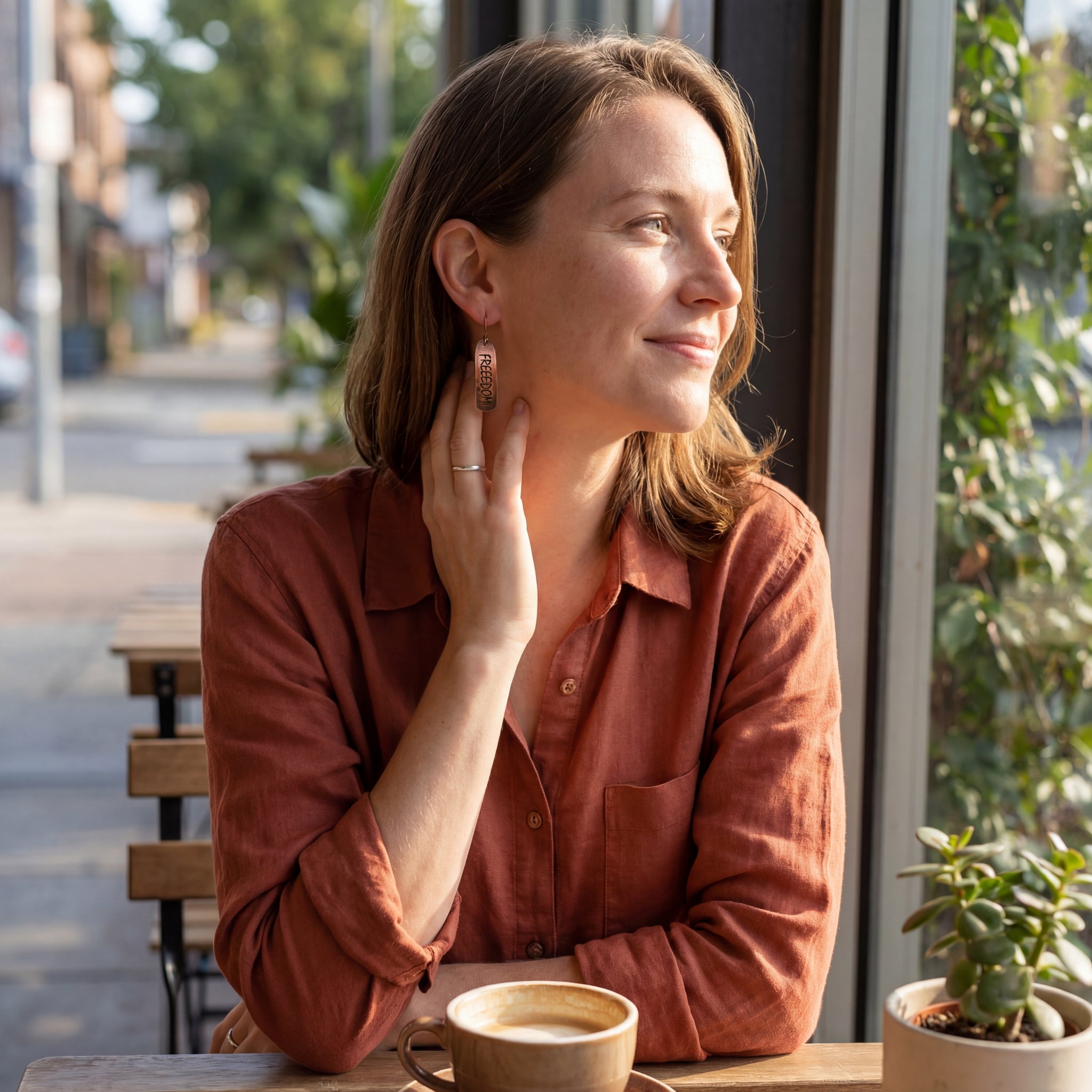 These earrings are created to celebrate our Freedoms. They are created in pure copper. I added texturing and then antiqued them to bring out the slogan. The copper is treated to maintain the finish and prevent oxidation.