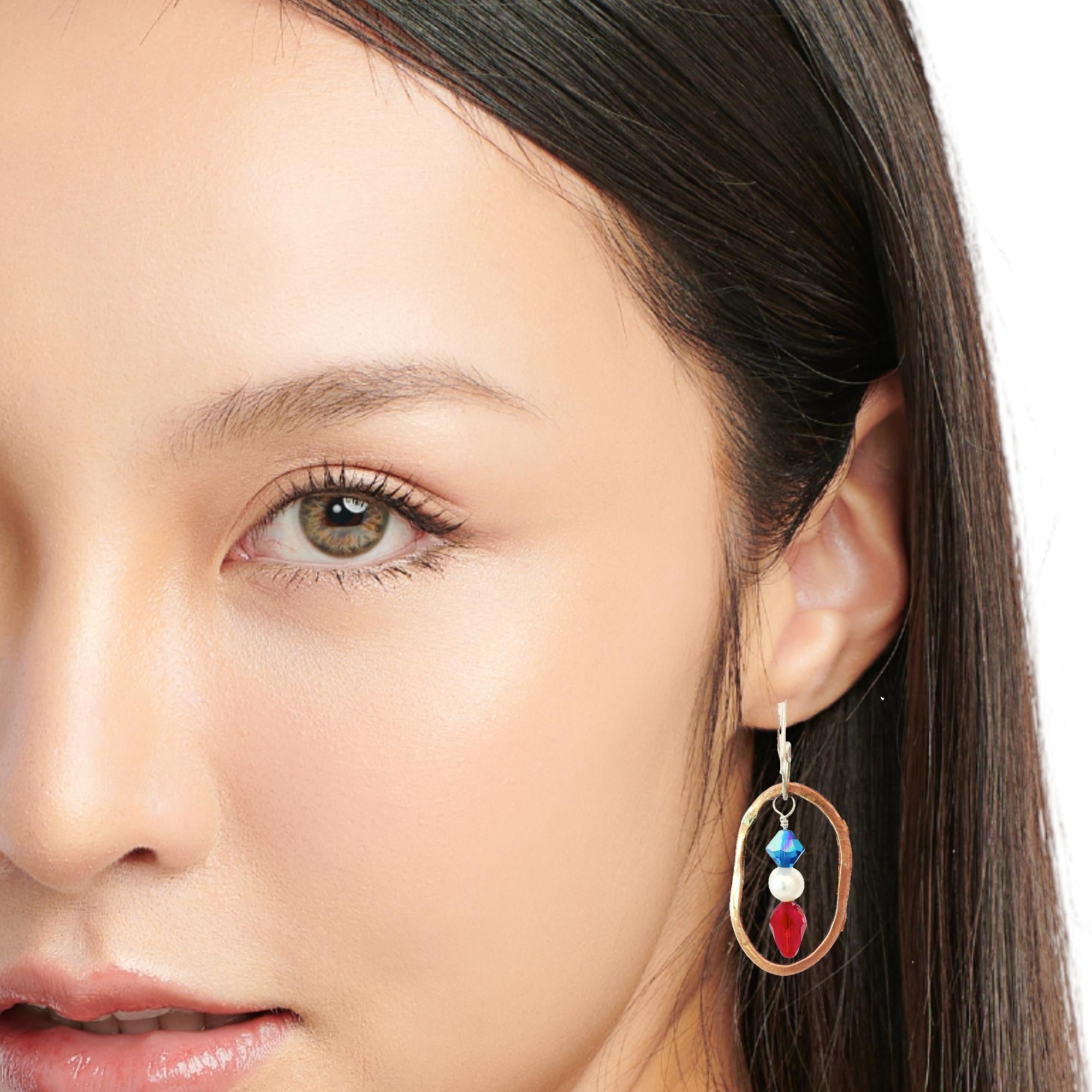 These earrings display our Patriotic colors of Red, White and Blue! They feature red and blue Swarovski crystals and white cultured pearls. The CopperHoop is textured. What better way to show off Your Pride in the USA!