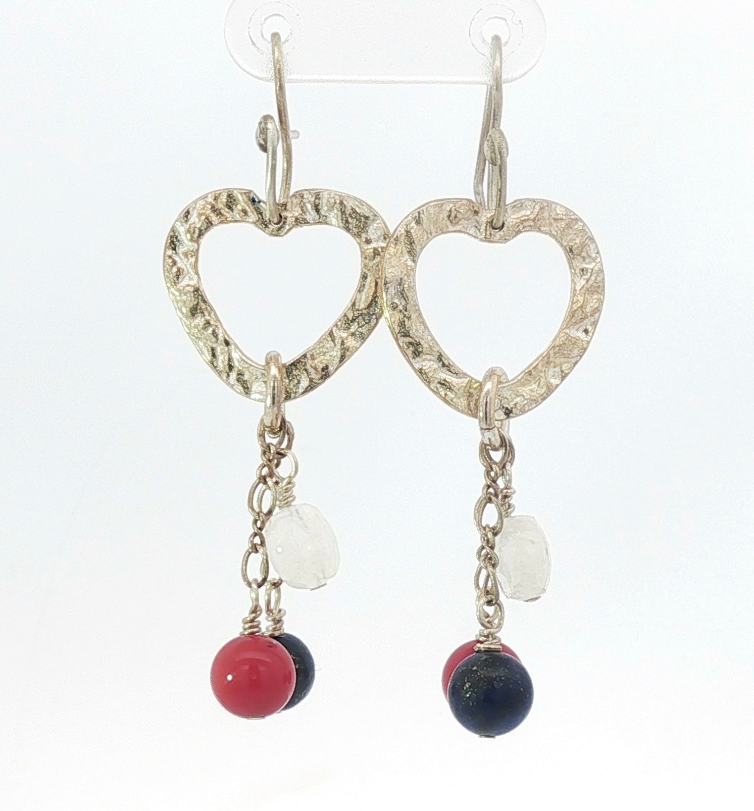 These earrings display our Patriotic colors of Red, White and Blue! They feature red coral, blue lapis and white moonstone gemstones. The sterling open heart istextured. What better way to show off Your Pride in the USA!