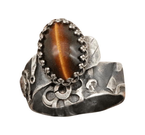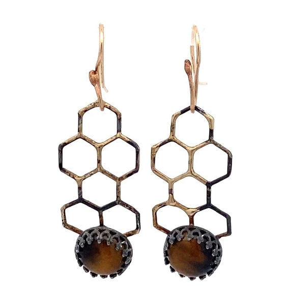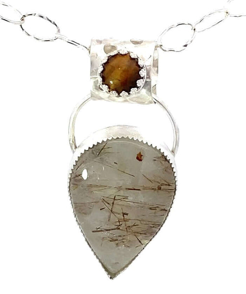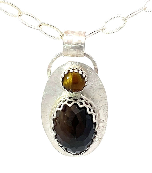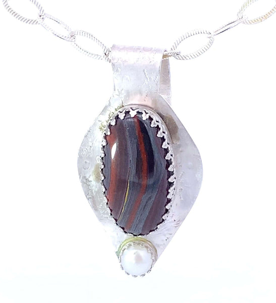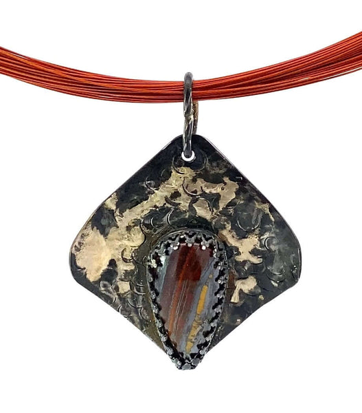 This design features copper fused with a sterling silver spiral design. Tiger eye gemstones are highlighted in the center of the pendant AND as a dangle from the pendant as well.