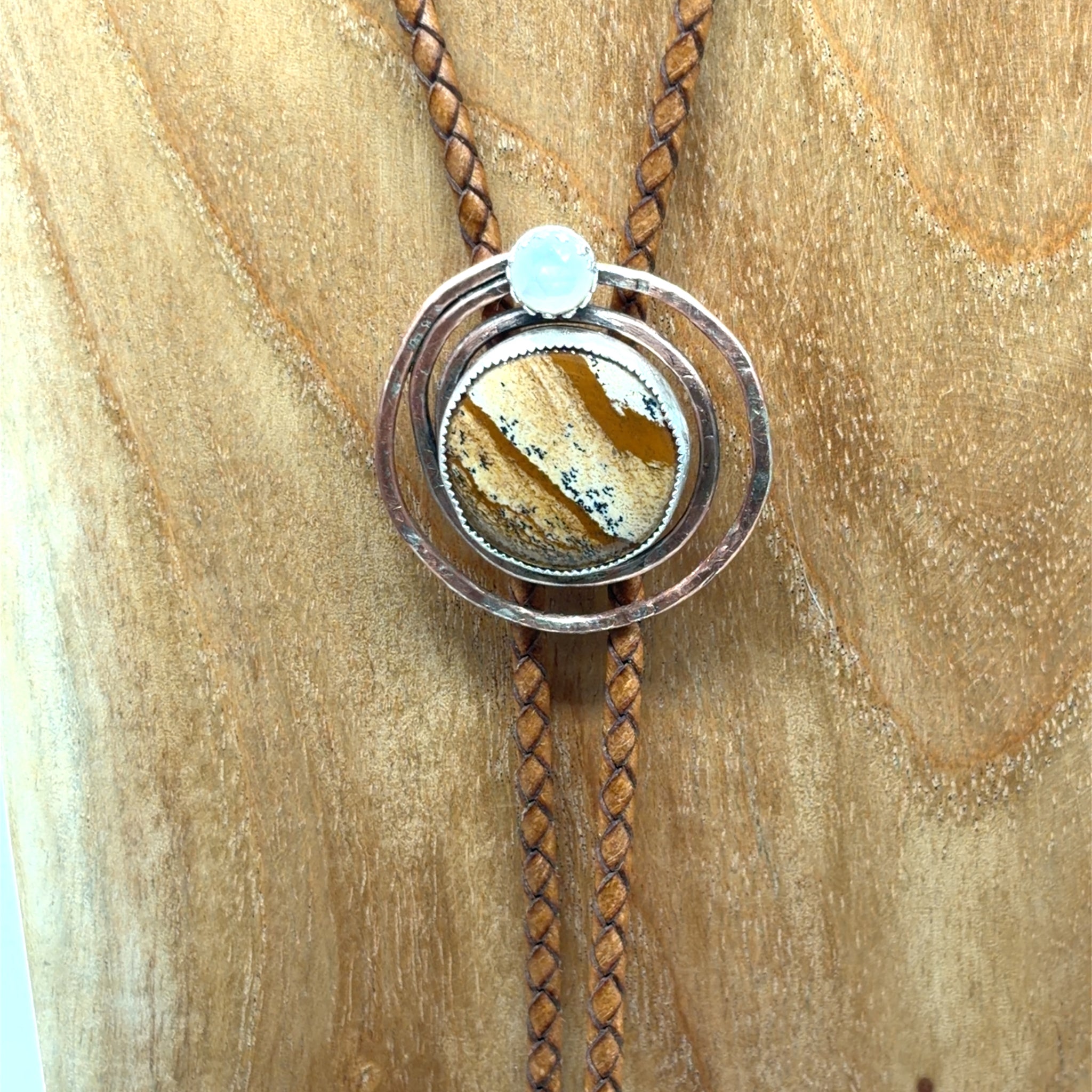 Pure copper is fused with fine and sterling silver create this Bolo Tie. The gems are picture jasper and faceted mother of pearl. I adore this combo! the caramel colored leather neck wire features copper tips.
