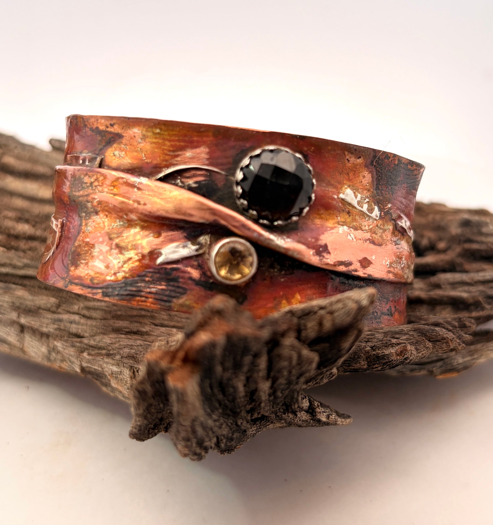 Are you a chocolate lover? I ADORE chocolate. This smoky quartz gem displays the richness of chocolate without the Calories! Since this is a member of the quartz family, the gem is durable as well as beautiful. A10mm faceted smoky quartz gem and 5mm citrine gem adorn this cuff.Copper is treated to maintain the finish and inhibit oxidation.