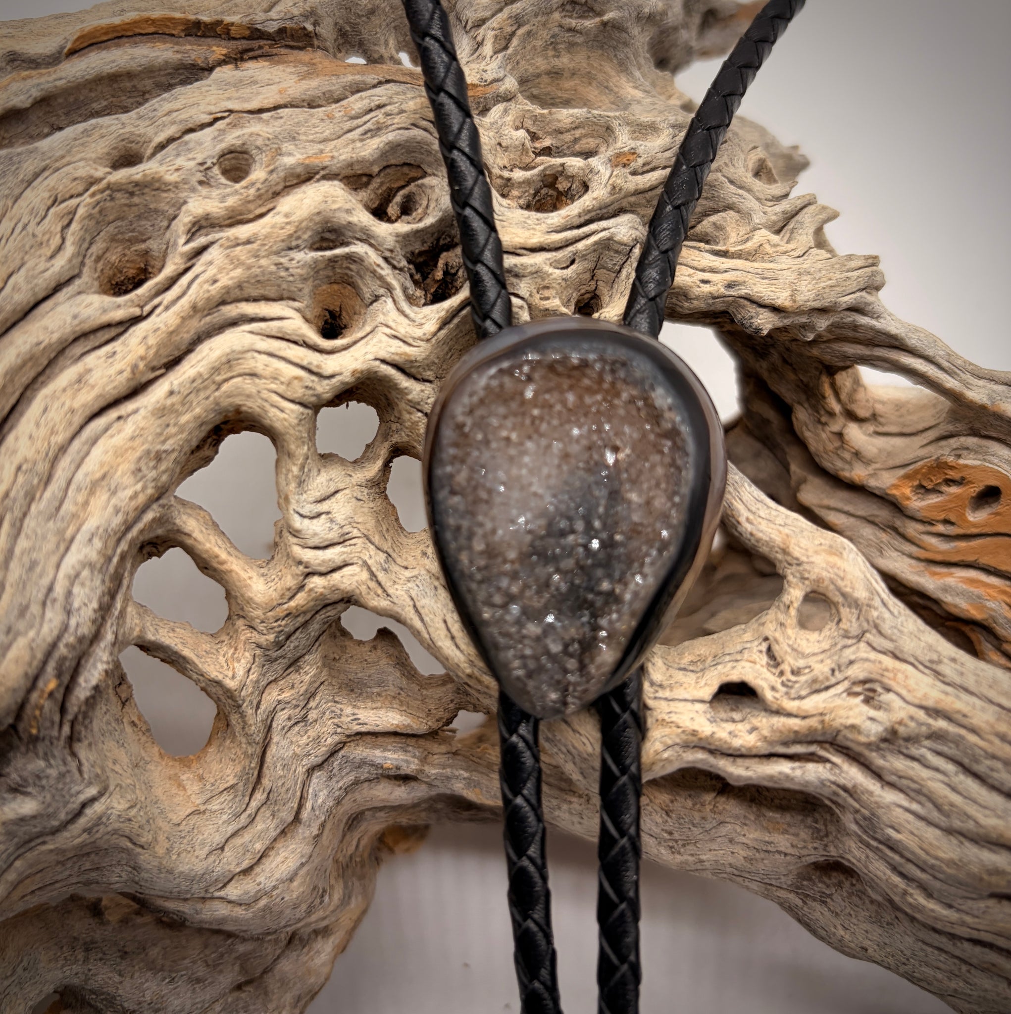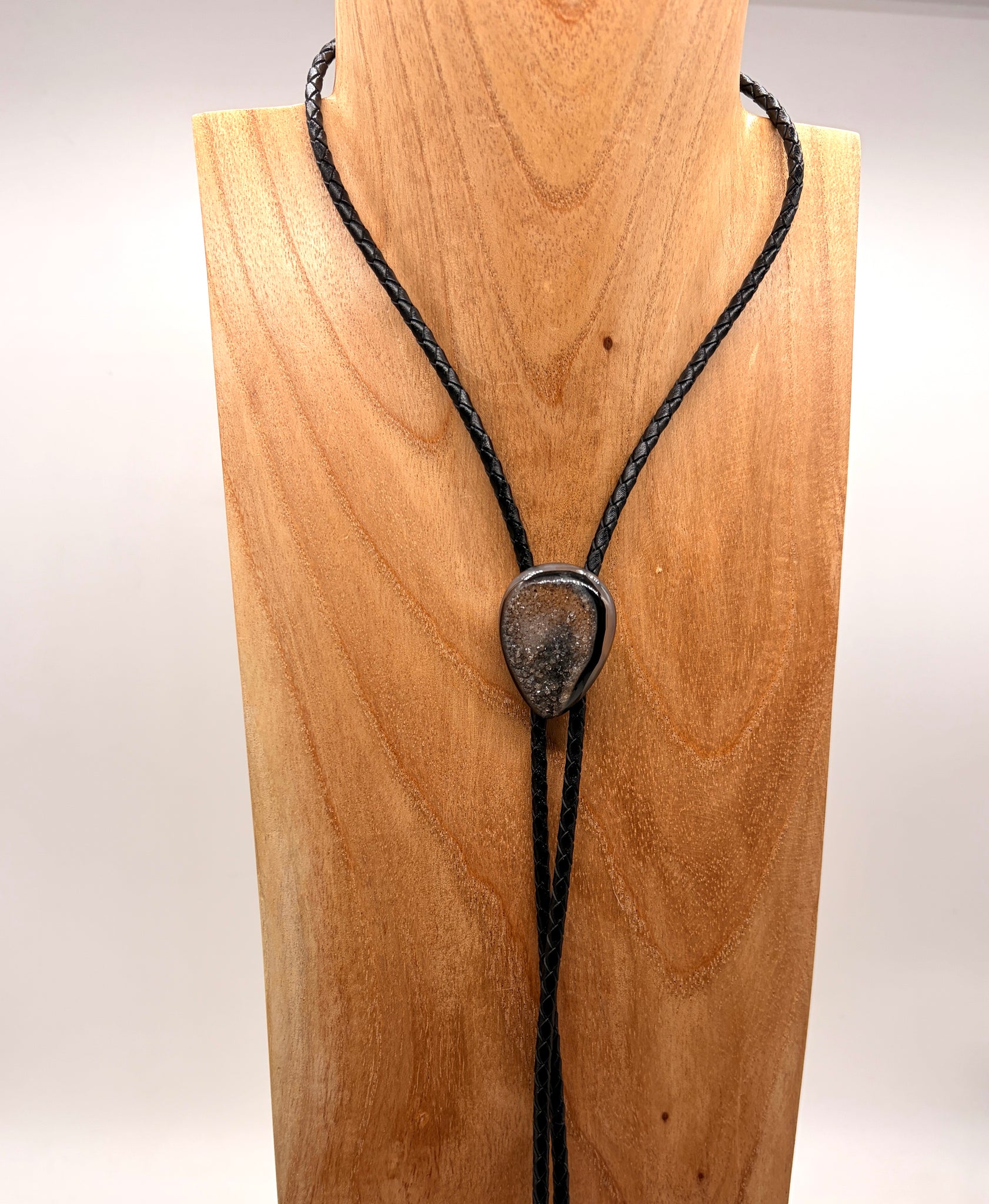 A deep rich black and grey teardrop shaped druzy quartz is the highlight of theis bolo tie. Bolo Tie. A black leather tie features bright silver tips. Druzy quartz gems grow slowly over millions of years. It is normally the very last layer of growth on agate. Many believe that wearing this gem helps us relax!